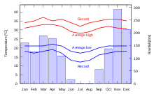 Since the country is located on the Equator, the climate is consistent year-round, with the average day temperature being a humid 24 °C (75 °F) and nights generally between 16 °C (61 °F) and 21 °C (70 °F). The average yearly rainfall ranges from 1,100 millimetres (43 in) in south in the Niari valley to over 2,000 millimetres (79 in) in central parts of the country. The dry season is from June to August while in the majority of the country the wet season has two rainfall maxima: one in March–May and another in September–November.
