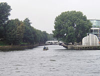 In the early 1980s a massive flood control device, the Thames Barrier, was opened — closed to tides several times a year to prevent water damage to London's low-lying areas upstream (as in the 1928 Thames flood for example). In the late 1990s, the 7-mile (11 km) long Jubilee River was built as a flood channel for the Thames around Maidenhead and Windsor.