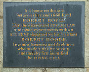 Boyle returned to England from the Continent in mid 1644 with a keen interest in science. His father had died the previous year and had left him the manor of Stalbridge in Dorset, together with some estates in Ireland. From that time, he devoted his life to scientific research, and soon took a prominent place in the band of inquirers, known as the " Invisible College", who devoted themselves to the cultivation of the "new philosophy". They met frequently in London, often at Gresham College; some of the members also had meetings at Oxford, and in that city Boyle went to reside in 1654. Reading in 1657 of Otto von Guericke's air-pump, he set himself with the assistance of Robert Hooke to devise improvements in its construction, and with the result, the "machina Boyleana" or "Pneumatical Engine", finished in 1659, he began a series of experiments on the properties of air. An inscription can be found on the wall of University College, Oxford in the High Street at Oxford (now the location of the Shelley Memorial), marking the spot where Cross Hall stood until the early 1800s. It was here that Boyle rented rooms from the wealthy apothecary who owned the Hall.