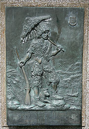 Plaque in Queen's Gardens, Hull – the former Queen's Dock from which Crusoe sailed – showing him on his island