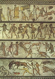 The Romans thought gladiator contests had originated with funeral games and sacrifices in which select captive warriors were forced to fight to expiate the deaths of noble Romans. Some of the earliest styles of gladiator fighting had ethnic designations such as " Thracian" or "Gallic." The staged combats were considered munera, "services, offerings, benefactions", initially distinct from the festival games (ludi). Throughout his 40-year reign, Augustus presented eight gladiator shows in which a total of 10,000 men fought, as well as 26 staged beast hunts that resulted in the deaths of 3,500 animals. To mark the opening of the Colosseum, the emperor Titus presented 100 days of arena events, with 3,000 gladiators competing on a single day. Roman fascination with gladiators is indicated by how widely they are depicted on mosaics, wall paintings, lamps, and even graffiti drawings.