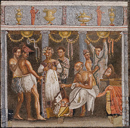 Mosaics are among the most enduring of Roman decorative arts, and are found on the surfaces of floors and other architectural features such as walls, vaulted ceilings, and columns. The most common form is the tessellated mosaic, formed from uniform pieces ( tesserae) of materials such as stone and glass. Mosaics were usually crafted on site, but sometimes assembled and shipped as ready-made panels. A mosaic workshop was led by the master artist (pictor) who worked with two grades of assistants.