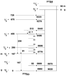 The American synthesis was independently confirmed in 1973 and secured the identification of rutherfordium as the parent by the observation of K-alpha X-rays in the elemental signature of the 257Rf decay product, nobelium-253.