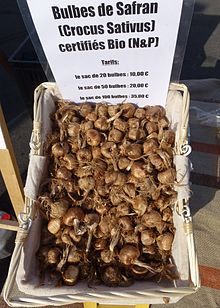 C. sativus prefers friable, loose, low-density, well-watered, and well-drained clay- calcareous soils with high organic content. Traditional raised beds promote good drainage. Soil organic content was historically boosted via application of some 20–30 tonnes of manure per hectare. Afterwards, and with no further manure application, corms were planted. After a period of dormancy through the summer, the corms send up their narrow leaves and begin to bud in early autumn. Only in mid-autumn do they flower. Harvests are by necessity a speedy affair: after blossoming at dawn, flowers quickly wilt as the day passes. All plants bloom within a window of one or two weeks. Roughly 150 flowers together yield but 1 g (0.035 oz) of dry saffron threads; to produce 12 g (0.42 oz) of dried saffron (or 72 g (2.5 oz) moist and freshly harvested), 1 kg (2.2 lb) of flowers are needed; 1 lb (0.45 kg) yields 0.2 oz (5.7 g) of dried saffron. One freshly picked flower yields an average 30 mg (0.0011 oz) of fresh saffron or 7 mg (0.00025 oz) dried.