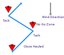 No sailboat can sail directly into the wind (known as being "in irons"), and for a given boat there is a minimum angle that it can sail relative to the wind; attempting to sail closer than that leads to the sails luffing and the boat will slow down and stop. This "no-go zone" (shown shaded in accompanying figure) is about 45° either side of the true wind for a modern sloop.