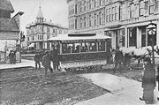 Seattle's first streetcar, at the corner of Occidental and Yesler, 1884.