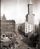 Pioneer Square in 1917 featuring the Smith Tower, the Seattle Hotel and to the left the Pioneer Building