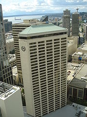 Washington Mutual's last headquarters, the WaMu Center, (now the Chase Centre and soon to be Russell Investments Center) (centre left) and its headquarters prior, Washington Mutual Tower (centre right).
