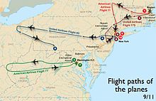 The flight paths of the four hijacked planes used in the terrorist attacks of September 11, 2001
