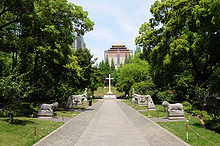 Shanghai's parks offer some reprieve from the urban jungle. Due to the scarcity of play space for children, nearly all parks have a children's section. The former racetrack turned central park, People's Square park is located in the heart of down town Shanghai and is known for its proximity to other major Shanghai landmarks. Fuxing Park, in the former French Concession of Shanghai, features formal French-style gardens and is surrounded by high end bars and cafes. Zhongshan Park in northwestern central Shanghai is famous for its monument of Chopin, the tallest statue dedicated to the composer in the world. Built in 1914 as Jessfield Park, it once contained the campus of St. John's University, Shanghai's first international college; today, it is known for its extensive rose and peony gardens, a large children's play area, and as the location of an important transfer station on the city's metro system. Shanghai Botanical Garden is located 12 km southwest of the city centre and was established in 1978. One of the newest is in the Xujiahui area – Xujiahui Park, built in 1999 on the former grounds of the Great Chinese Rubber Works Factory and the EMI Recording Studio (now La Villa Rouge restaurant). The park has a man-made lake with a sky bridge running across the park, and offers a pleasant respite for Xujiahui shoppers.
