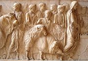 A 1st century CE relief of a bull, a sheep and a pig being led to sacrifice in Rome