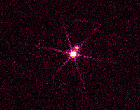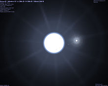 Sirius is a binary star system consisting of two white stars orbiting each other with a separation of about 20 astronomical units (3.0×109 km; 1.9×109 mi) (roughly the distance between the Sun and Uranus) and a period of 50.1 years. The brighter component, termed Sirius A, is a main-sequence star of spectral type A1V, with an estimated surface temperature of 9,940 K. Its companion, Sirius B, is a star that has already evolved off the main sequence and become a white dwarf. Currently 10,000 times less luminous in the visual spectrum, Sirius B was once the more massive of the two. The age of the system has been estimated at around 230 million years. Early in its lifespan it was thought to have been two bluish white stars orbiting each other in an elliptical orbit every 9.1 years. The system emits a higher than expected level of infrared radiation, as measured by IRAS space-based observatory. This may be an indication of dust in the system, and is considered somewhat unusual for a binary star. The Chandra X-ray Observatory image shows Sirius B outshining its bright partner as it is a brighter X-ray source.