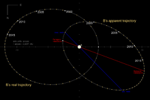 The orbital motion of the Sirius binary system brings the two stars to a minimum angular separation of 3 arcseconds and a maximum of 11 arcseconds. At the closest approach, it is an observational challenge to distinguish the white dwarf from its more luminous companion, requiring a telescope with at least 300 mm (12 in) aperture and excellent seeing conditions. A periastron occurred in 1994 and the pair have since been moving apart, making them easier to separate with a telescope.