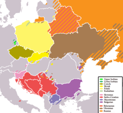 Because of the vastness and diversity of the territory occupied by Slavic people, there were several centers of Slavic consolidation. In the 19th century, Pan-Slavism developed as a movement among intellectuals, scholars, and poets, but it rarely influenced practical politics and didn't find support in all nations that had Slavic origins. Pan-Slavism became compromised when Russian Empire started to use it as an ideology justifying its territorial conquests in Central Europe as well as subjugation of other ethnic groups of Slavic origins such as Poles or Ukrainians, and the ideology became associated with Russian imperialism. The common Slavic experience of communism combined with the repeated usage of the ideology by Soviet propaganda after World War II within the Eastern bloc ( Warsaw Pact) was a forced high-level political and economic hegemony of the USSR dominated by Russians. A notable political union of the 20th century that covered many South Slavs was Yugoslavia, but it was broken apart as well.