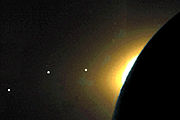 The ecliptic viewed in sunlight from behind the Moon in this Clementine image. From left to right: Mercury, Mars, Saturn.