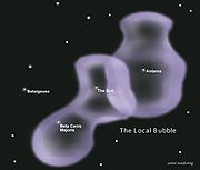 The immediate galactic neighbourhood of the Solar System is known as the Local Interstellar Cloud or Local Fluff, an area of dense cloud in an otherwise sparse region known as the Local Bubble, an hourglass-shaped cavity in the interstellar medium roughly 300 light years across. The bubble is suffused with high-temperature plasma that suggests it is the product of several recent supernovae.