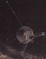Artist's conception of Pioneer 10, which passed the orbit of Pluto in 1983. The last transmission was received in January 2003, sent from approximately 82 AU away. The 35-year-old space probe is now receding from the Sun at over 43,400 km/h (27,000 mph).