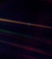 A photo of Earth (circled) taken by Voyager 1, 6.4 billion km (4 billion miles) away. The streaks of light are diffraction spikes radiating from the Sun (off frame to the left). This photograph is known as " Pale Blue Dot".
