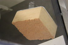 A mock-up of a space shuttle leading edge made with an RCC-panel taken from Discovery. Simulation of known and possible conditions of the foam impact on Columbia's final launch showed Brittle fracture of RCC.
