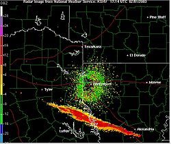 Columbia debris (in red, orange, and yellow) detected by National Weather Service radar over Texas and Louisiana.