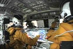 • 8:15:30 (EI-1719) – Husband and McCool executed the de-orbit burn using Columbia’s two Orbital Maneuvering System engines.