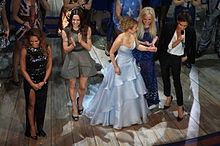 The Spice Girls performing during their penultimate reunion concert in Toronto, Ontario, in February 2008. (L–R) Chisholm, Beckham, Halliwell, Brown, Bunton.