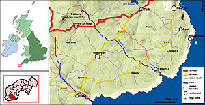 Being one of the most westerly parishes in England, St Buryan is somewhat isolated from the rest of the UK. The village of St Buryan is situated approximately five miles (eight km) west of Penzance along the B3283 which forks about five miles (8 km) from the end of the A30, the major trunk road that runs the length of Cornwall. Three further minor roads also meet at St Buryan, two link the village with the B3315 towards Lamorna, and the third rejoins the A30 at Crows-an-Wra. St. Buryan is served by four bus routes. Services 1 and 1A run between Penzance and Land's End via Gwavas, Sheffield, St Buryan and Sennen. The 300 service runs a circular route via St Ives, St Just, Sennen, St Buryan and Newlyn. These routes are run by First Devon & Cornwall, part of First Group. Western Greyhound service 501 runs on the same route as the 1/1A. Services run frequently from Penzance to the village until around 10 pm during the summer months, but markedly less often in the winter. Travel by rail is via the Great Western Main Line whose westernmost terminus is located at nearby Penzance. First Great Western provides local services to nearby St Ives via the St Ives Bay Line as well as direct connections linking Penzance with Plymouth, Bath, Bristol, Newport and Cardiff. Intercity services are provided both by First Great Western, connecting Penzance with London Paddington, and CrossCountry who run services to Manchester via the West Coast Main Line and also direct services to Edinburgh Waverley and Glasgow Central via Birmingham, Sheffield, York, Leeds and Newcastle upon Tyne. St Buryan's closest airports are Land's End Aerodrome, with flights to the Isles of Scilly; and Newquay which carries flights to Gatwick and Stansted.
