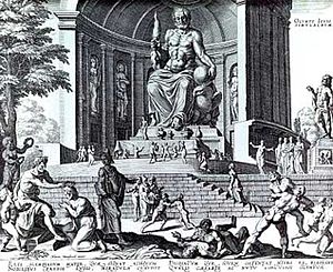 The Statue of Zeus at Olympia was one of the classic Seven Wonders of the Ancient World. It was made by the famed Greek sculptor of the Classical period, Phidias, circa 432 BC on the site where it was erected in the temple of Zeus, Olympia, Greece.