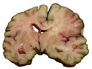 A slice of brain from the autopsy of a person who suffered an acute middle cerebral artery (MCA) stroke