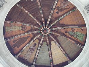 The Sunol Water Temple is an unusual structure located at 505 Paloma Way in Sunol, California. Designed by Willis Polk, the 18-meter high classical pavilion is made up of twelve concrete Corinthian columns and a concrete ring girder that supports the conical wood and tile roof. Inside the temple, water originally from the Pleasanton well fields and Arroyo de la Laguna flowed into a white tiled cistern before plunging into a deeper water channel carrying water from the filter galleries to the Niles Aqueduct in Niles Canyon and across San Francisco Bay near the Dumbarton Bridge. The roof covering the cistern has paintings depicting Indian maidens carrying water vessels.
