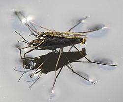 Surface tension is a property of the surface of a liquid that causes it to behave as an elastic sheet. It allows insects, such as the water strider (pond skater, UK), to walk on water. It allows small objects, even metal ones such as needles, razor blades, or foil fragments, to float on the surface of water, and it is the cause of capillary action.