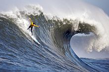 Maverick's or Mavericks is a world-famous surfing location in Northern California. It is located approximately one-half mile (0.8 km) from shore in Pillar Point Harbour, just North of Half Moon Bay at the village of Princeton-By-The-Sea. After a strong winter storm in the Northern Pacific Ocean, waves can routinely crest at over 25 feet (8m) and top out at over 50 feet (15m). The break is caused by an unusually-shaped underwater rock formation.