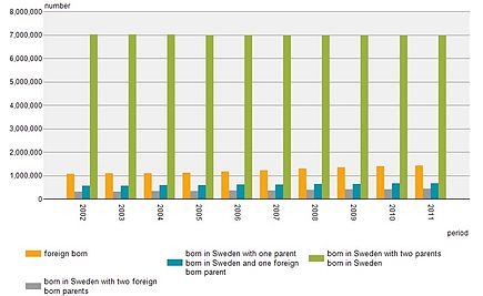 According to Eurostat, in 2010, there were 1.33 million foreign-born residents in Sweden, corresponding to 14.3% of the total population. Of these, 859 000 (9.2%) were born outside the EU and 477 000 (5.1%) were born in another EU Member State.