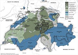 By 1353, the three original cantons had joined with the cantons of Glarus and Zug and the Lucerne, Zurich and Bern city states to form the "Old Confederacy" of eight states that existed until the end of the 15th century. The expansion led to increased power and wealth for the federation. By 1460, the confederates controlled most of the territory south and west of the Rhine to the Alps and the Jura mountains, particularly after victories against the Habsburgs ( Battle of Sempach, Battle of Näfels), over Charles the Bold of Burgundy during the 1470s, and the success of the Swiss mercenaries. The Swiss victory in the Swabian War against the Swabian League of Emperor Maximilian I in 1499 amounted to de facto independence within the Holy Roman Empire.