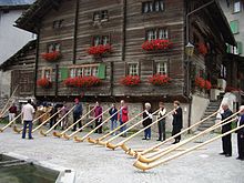 Alpine symbolism has played an essential role in shaping the history of the country and the Swiss national identity. Nowadays some concentrated mountain areas have a strong highly energetic ski resort culture in winter, and a hiking (wandering) or Mountain biking culture in summer. Other areas throughout the year have a recreational culture that caters to tourism, yet the quieter seasons are spring and autumn when there are fewer visitors. A traditional farmer and herder culture also predominates in many areas and small farms are omnipresent outside the cities. Folk art is kept alive in organisations all over the country. In Switzerland it is mostly expressed in music, dance, poetry, wood carving and embroidery. The alphorn, a trumpet-like musical instrument made of wood, has become alongside yodeling and the accordion an epitome of traditional Swiss music.