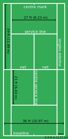 Tennis is played on a rectangular, flat surface, usually grass, clay, a hardcourt of concrete and/or asphalt and occasionally carpet (indoor). The court is 78 feet (23.77 m) long, and 27 feet (8.23 m) wide for singles matches and 36 ft (10.97 m) for doubles matches. Additional clear space around the court is required in order for players to reach overrun balls. A net is stretched across the full width of the court, parallel with the baselines, dividing it into two equal ends. The net is 3 feet 6 inches (1.07 m) high at the posts and 3 feet (0.914 m) high in the centre. The net posts are 3 feet (0.914 m) outside the doubles court on each side or, for a singles net, 3 feet (0.914 m) outside the singles court on each side.