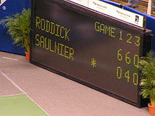 The score of a tennis match during play is always read with the serving player's score first. In tournament play, the chair umpire calls the point count (e.g., "fifteen-love") after each point. At the end of a game, the chair umpire also announces the winner of the game and the overall score.