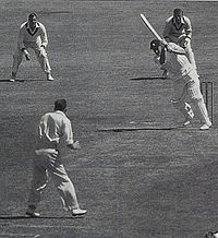 Aged 38 and having been unwell during the war, Bradman had been reluctant to play. He batted unconvincingly and reached 28 when he hit a ball to Jack Ikin; England believed it was a catch, but Bradman stood his ground, believing it to be a bump ball. The umpire ruled in the Australian captain's favour and he appeared to regain his fluency of yesteryear, scoring 187. Australia promptly seized the initiative, won the First Test convincingly and inaugurated a dominant post-war era. The controversy over the Ikin catch was one of the biggest disputes of the era.