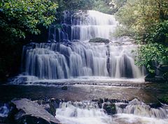 The Catlins boasts a rugged, scenic coastline. Natural features include sandy beaches, blowholes, a petrified forest at Curio Bay, and the Cathedral Caves, which visitors can reach at low tide. Much of the coastline is high cliff, with several faces over 150 m (500 ft) in height, and the land rises sharply from the coast at most points. For this reason, many of the area's rivers cascade over waterfalls as they approach the ocean (notably the iconic Purakaunui Falls on the short Purakaunui River).