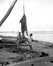 While Santiago continues his journey back to the shore, sharks are attracted to the trail of blood left by the marlin in the water. The first, a great mako shark, Santiago kills with his harpoon, losing that weapon in the process. He makes a new harpoon by strapping his knife to the end of an oar to help ward off the next line of sharks; in total, five sharks are slain and many others are driven away. But the sharks keep coming, and by nightfall the sharks have almost devoured the marlin's entire carcass, leaving a skeleton consisting mostly of its backbone, its tail and its head. Finally reaching the shore before dawn on the next day, Santiago struggles on the way to his shack, carrying the heavy mast on his shoulder. Once home, he slumps onto his bed and falls into a deep sleep.