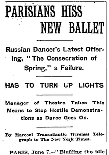 The Rite of Spring, French title Le Sacre du printemps (Russian: «Весна священная», Vesna svyashchennaya) is a ballet and orchestral concert work by the Russian composer Igor Stravinsky. It was written for the 1913 Paris season of Sergei Diaghilev's Ballets Russes company, with choreography by Vaslav Nijinsky and stage designs and costumes by Nicholas Roerich. When the ballet was first performed, at the Théâtre des Champs-Élysées on 29 May 1913, the avant-garde nature of the music and choreography caused a near-riot in the audience. Although designed as a work for the stage, with specific passages accompanying characters and action, the music achieved growing success as a concert piece and later became recognised as one of the most influential musical works of the 20th century. It is widely performed in the concert hall, and is frequently revived on the stage.