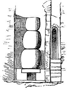 There were three boilers, one of which (caldarium vas) held the hot water; a second, the tepid (tepidarium); and the third, the cold (frigidarium). The warm water was turned into the warm bath by a pipe through the wall, marked on the plan. Underneath the hot chamber was set the circular furnace d, of more than 7 ft. in diameter, which heated the water and poured hot air into the hollow cells of the hypocaustum. It passed from the furnace under the first and last of the caldrons by two flues, which are marked on the plan. The boiler containing hot water was placed immediately over the furnace; and, as the water was drawn out from there, it was supplied from the next, the tepidarium, which was raised a little higher and stood a little way off from the furnace. It was already considerably heated from its contiguity to the furnace and the hypocaust below it, so that it supplied the deficiency of the former without materially diminishing its temperature; and the vacuum in this last was again filled up from the farthest removed, which contained the cold water received directly from the square reservoir seen behind them. The boilers themselves no longer remain, but the impressions which they have left in the mortar in which they were imbedded are clearly visible, and enable us to determine their respective positions and dimensions. Such coppers or boilers appear to have been called miliaria, from their similarity of shape to a milestone.