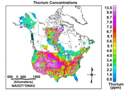 Partial North American map of thorium concentrations from the United States Geological Survey. Maps of lunar and martian thorium have also been prepared.