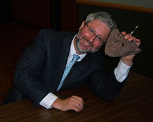 Neil Shubin, one of the paleontologists who discovered Tiktaalik, holding a cast of its skull