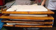 The curds are processed differently depending on the form of tofu that is being manufactured. For soft silken tofu ( 嫩 豆 腐; nèn dòufu) or tofu flower ( 豆 花, dòuhuā) the soy milk is curdled directly in the tofu's selling package. For standard firm Asian tofu, the soy curd is cut and strained of excess liquid using cheese cloth or muslin and then lightly pressed to produce a soft cake. Firmer tofus, such as Asian dry tofu ( 豆 干) or Western types of tofu, are further pressed to remove even more liquid. In Vietnam, the curd is strained and molded in a square mold and the end product is called đậu khuôn (molded bean) or đậu phụ (one of the Vietnamese ways to pronounce the Chinese dòufu). The tofu curds are allowed to cool and become firm. The finished tofu can then be cut into pieces, flavored or further processed.