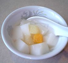 In Chinese cuisine, Dòuhuā ( 豆 花) is served with toppings like boiled peanuts, azuki beans, cooked oatmeal, tapioca, mung beans and a syrup flavored with ginger or almond. During the summer, "dòuhuā" is served with crushed ice; in the winter, it is served warm. And also, in many parts of China, fresh tofu is similarly eaten with soy sauce or further flavored with " katsuobushi" shavings, century eggs ( 皮 蛋 pídàn), and sesame seed oil.