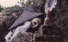There are three methods of burial: the coffin may be laid in a cave or in a carved stone grave, or hung on a cliff. It contains any possessions that the deceased will need in the afterlife. The wealthy are often buried in a stone grave carved out of a rocky cliff. The grave is usually expensive and takes a few months to complete. In some areas, a stone cave may be found that is large enough to accommodate a whole family. A wood-carved effigy, called Tau tau, is usually placed in the cave looking out over the land. The coffin of a baby or child may be hung from ropes on a cliff face or from a tree. This hanging grave usually lasts for years, until the ropes rot and the coffin falls to the ground.