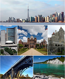 | From top left: Downtown Toronto featuring the CN Tower and Financial District from the Toronto Islands, City Hall, the Ontario Legislative Building, Casa Loma, Prince Edward Viaduct, and the Scarborough Bluffs | |||
