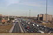 There are a number of municipal expressways and provincial highways that serve Toronto and the Greater Toronto Area. In particular, Highway 401 bisects the city from west to east, bypassing the downtown core. It is the busiest road in North America, and one of the busiest highways in the world. The main municipal expressways in Toronto include the Gardiner Expressway, the Don Valley Parkway, and to some extent, Allen Road. The square grid of major city streets was laid out by the concession road system, in which each major arterial road is approximately two kilometres apart from each parallel route. Major east-west arterial roads are generally parallel with Lake Ontario and major north-south arterial roads are roughly perpendicular with Lake Ontario.