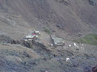 Stone-built refuges used at base camp.